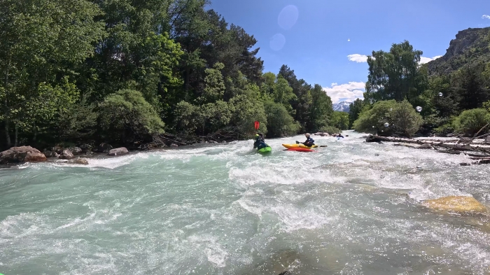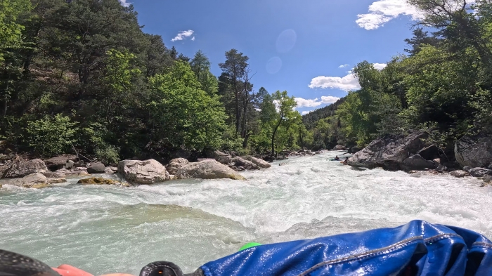 Na een paar meter rustig water vertrekt de Durance in een lange denderende versnelling. Bruno klassificeerde het vooraf nog als "een beetje drop-pool". Drop klopt, de pools waren weg ?.