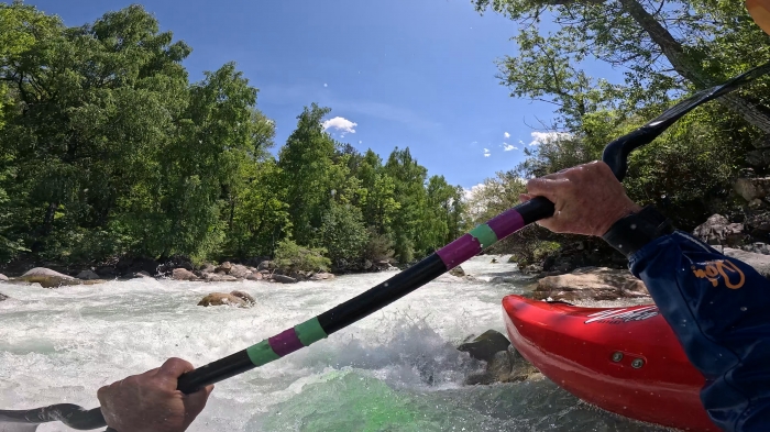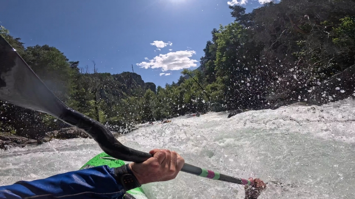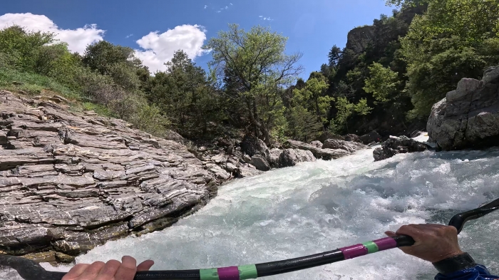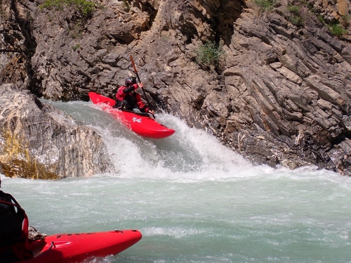 De kloof wordt hoger en steiler met soms loodrechte wanden, schitterend. De passages worden minder heftig totdat de hele rivier links in een 2 meter brede gang verdwijnt. "Slot en drop" wordt verkend waarbij de meesten hun boot alvast mee nemen. Dan blijkt het toch wel te doen, de "slot" is bij deze waterstand makkelijk en de drop op tempo goed te boofen.