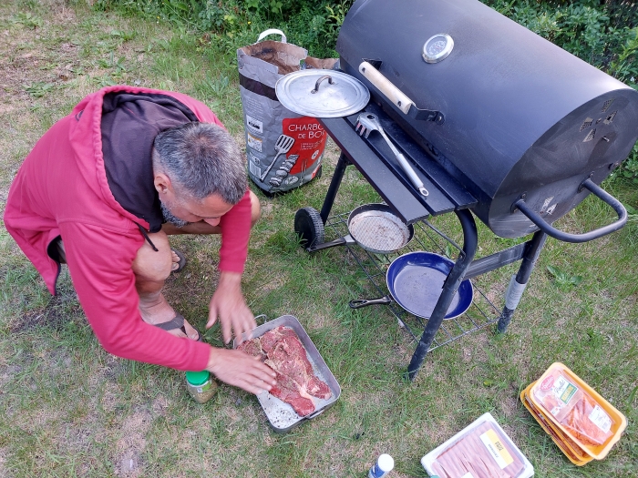 De mannen zien me worstelen en komen te hulp. Een rol bitumentape wordt bij de nabije bricolage gekocht. Peter en ik slopen het zitje uit de boot, Gert (net aangekomen uit BE) boort gaatjes op het einde van de barst en Bruno plakt er twee lagen tape in.