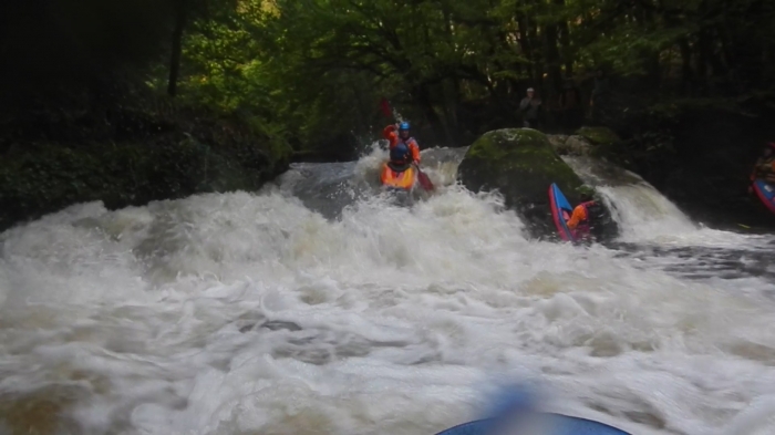 Mooi weertje, gezellige drukte... of toch heel soms een beetje een 'te' gezellige drukte. Tijdens onze afdalingen viel het best mee, we konden overal opdragen en verschillende keren de versnellingen varen. Maar soms kwam er een golf van kajakkers aan, keerwaters vol en dus zonder kijken of stoppen naar beneden donderen... te gek om te zien.. van aan de kant :-)))