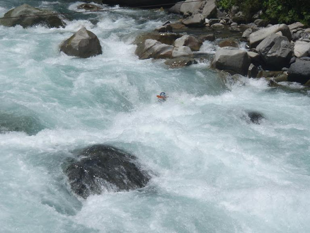 Dan vaart Senior Guida ons voorbij, nadert langzaam verder, doet dan gauw het OK-teken en zet zich schrap om de versnelling af te denderen. Pepe en voenkel zien het OK teken en zetten ook aan. Ik volg in hun kielzog. Van zodra ik de versnelling van dichterbij kan aanschouwen ziet het er verdomd wild uit. Ik geef wat extra peddelslagen om snelheid te maken en zoek een lijn. Ondertussen zie ik af en toe de boten van pepe en voenkel piepen uit de golven. Alleen, ofwel is de boot al leeg ofwel hangt de persoon in kwestie onderaan...
