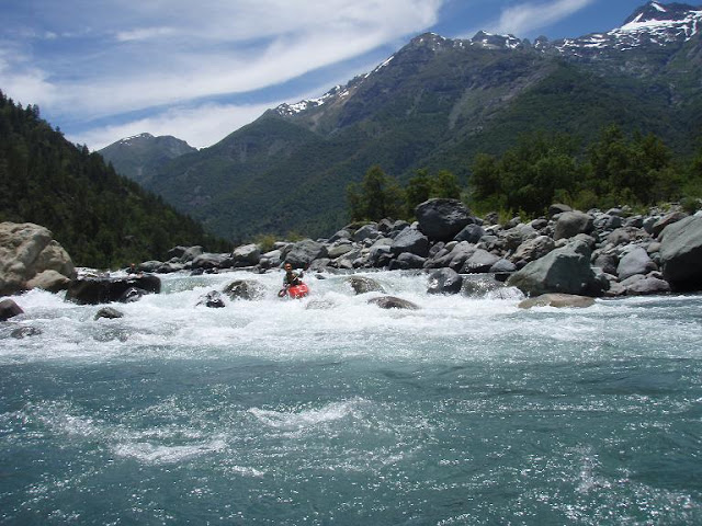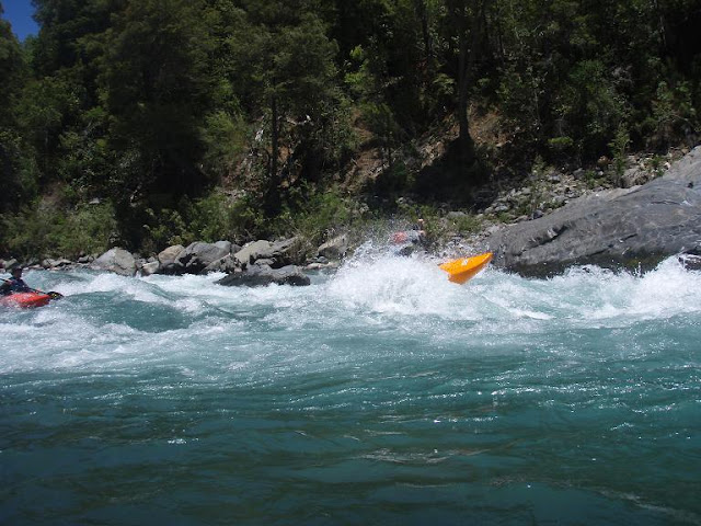 Bij het ontwaken aanschouwen we voor het eerst de Rio Nueble. Een relatief brede rivier met kristalhelder water en bezaaid met rotsen. De bescrijving uit de gids belooft ons een volle klasse IV. Na het ontbijt rijden we door tot het einde van de weg (als je dit hier al wegen kan noemen). De instap is op de Rio Sauces, een zijrivier die een halve kilometer verder uitmondt in de Rio Nueble. Cas en Harry moeten nog even een boek terug brengen naar de bibliotheek, de rest stap in.