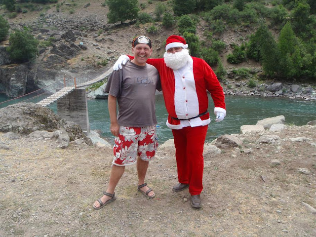 Net voor we aanzetten komt de kerstman ons nog even uitzwaaien. Het blijft toch een gek gezicht; het is hier midden zomer, straalblauwe lucht, 30 graden en dan verzchijnt uit het niets een man met grijze baard en een dik rood pak.