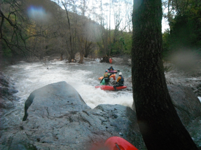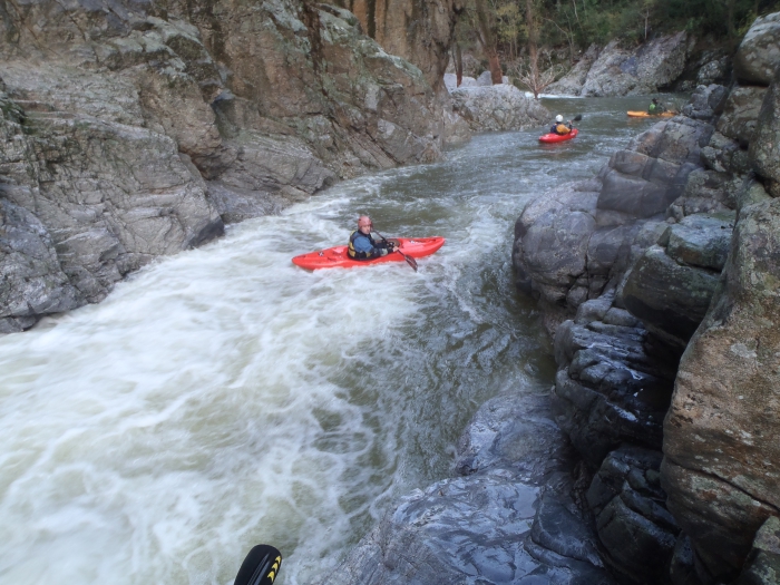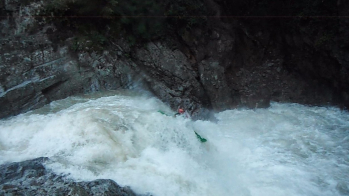 Ik vaar perfect aan mik precies naar een overspoelde rots in het midden, zet mijn 'boof'-slag en trek mijn boot in de lucht.