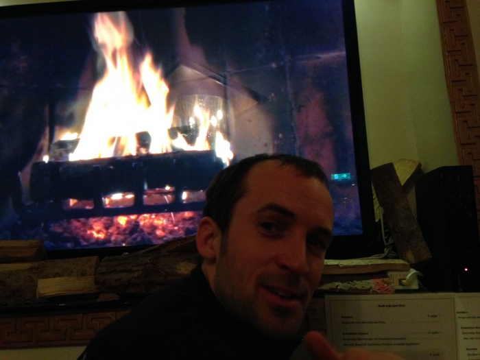 sander warmt zich wat aan de open haard