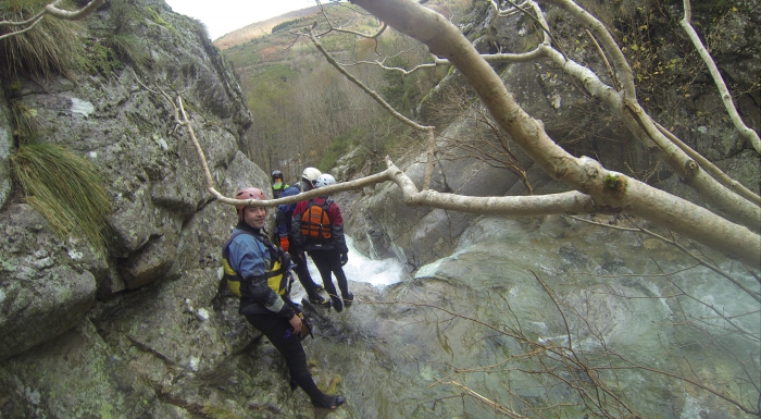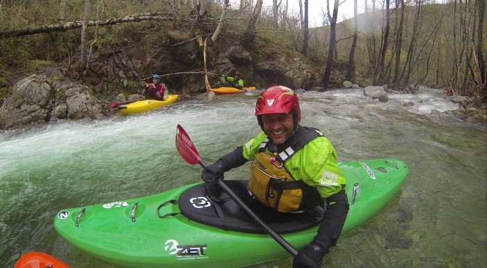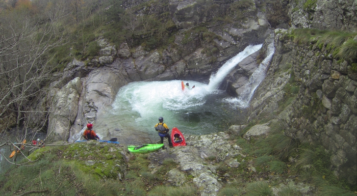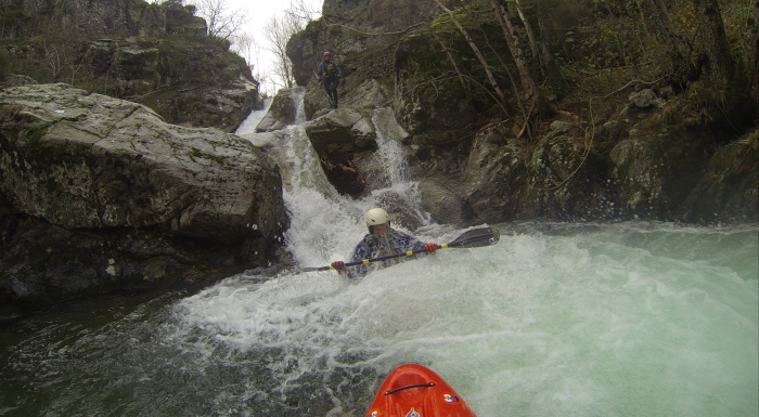 De rivier blijft continue stenen, versnellingen, sprongetjes en hier en daar wat hout aanbieden. Harry (uitgeschakeld door rugproblemen) volgt met de wagen. Aan een sprong geeft hij aanwijzingen. Blijkbaar erg nuttig want mijn voorgangers zie ik zonder problemen de sprong maken. Ik maak me dus niet te veel zorgen en vaar het keerwater voor de sprong in. Efkes uitstappen en gaan kijken was beter geweest: ik spring te veel naar links, boof niet goed genoeg en blijf stom in de rappel steken. Het duurt veel te lang voor ik weer boven kom en ik ben blij dat de rappel me niet op een tweede rondje trakteert. Aan Bruno zijn puntje kom ik er uit en het duurt nog even voor we de boot aan de kant hebben (Jorg maakt er eerst nog misbruik van om over de rappel te varen).