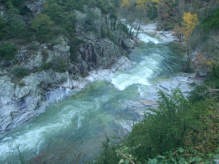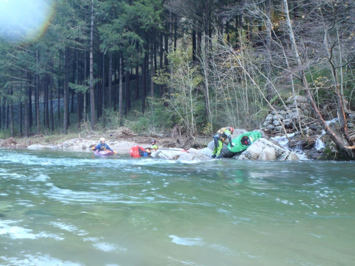 Volgens de gids is de instap van het middenstuk een 500 m verder dan de uitstap van het bovenstuk. Als echte luxebeesten worden onze boten met de remorque 500 m verder getransporteerd door de afhakers terwijl de diehards rustig kunnen doorwandelen naar de instap. Ondertussen spelen we nog gauw wat brood en snacks naar binnen om opnieuw wat op krachten te komen en zien we ook waarom we die 500 m moesten wandelen. Tussen de twee stukken zit een grote stuw met daarachter een lelijke scherpe stenentuin.