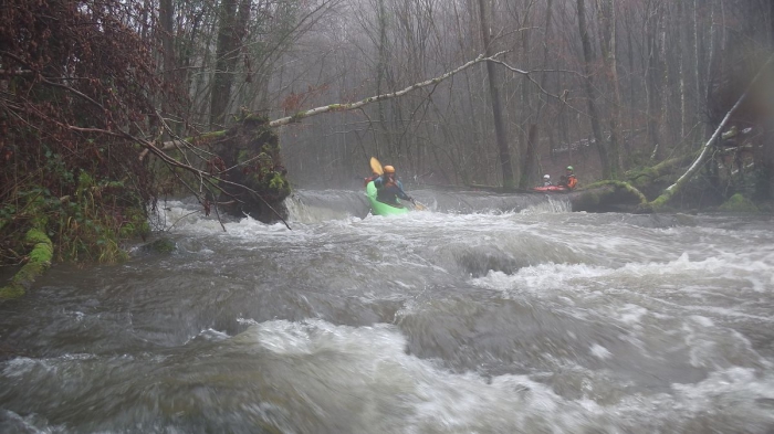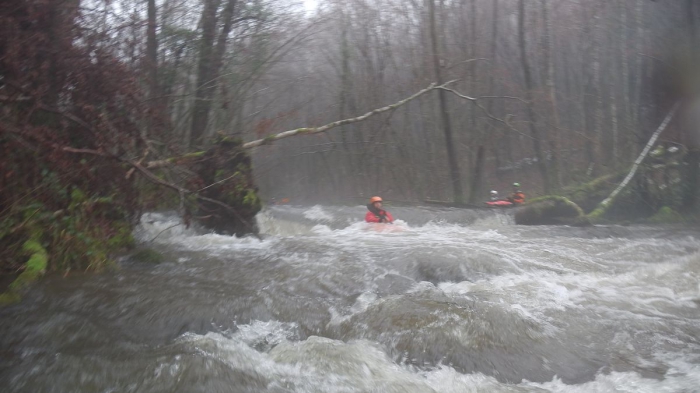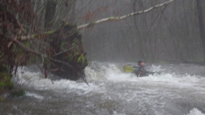 We loodsen ons door enkele versperringen, Peter en Wim passeren nipt een boomstronk met een zijtak. Ik volg hen, maar kan op het laatste moment niet bijsturen, kwam met mijn schouder tegen de zijtak, Dimi mocht nog eens zwemmen en weer zoeken naar de peddel.