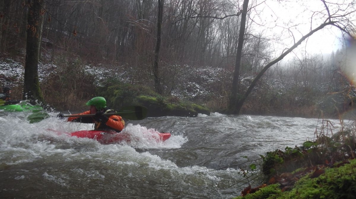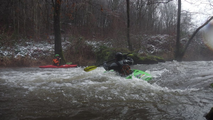 Aankomst om 10u15, opstapplaats Maissin Boven-Lesse. Er ligt een klein laagje sneeuw en de temperatuur is net boven het vriespunt, we varen af samen met de Kastelse Kajak club.