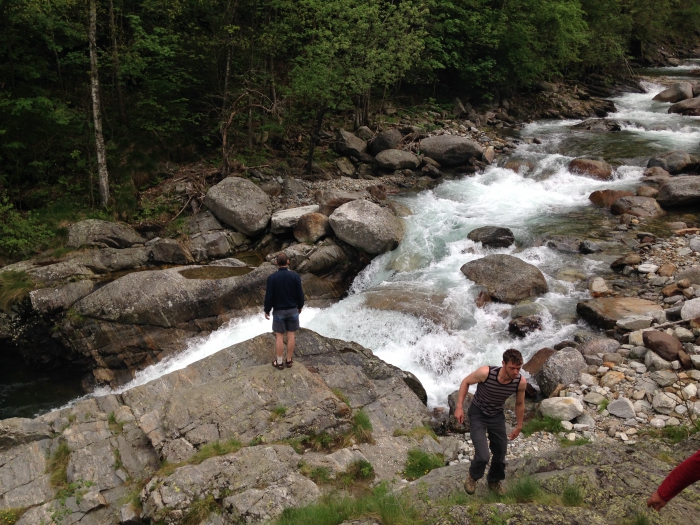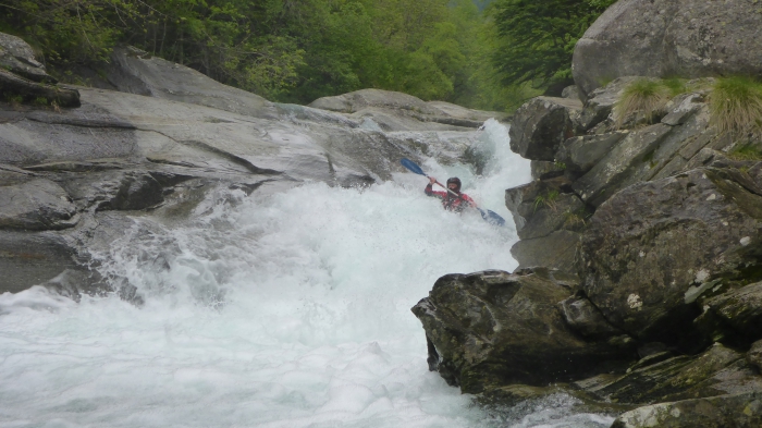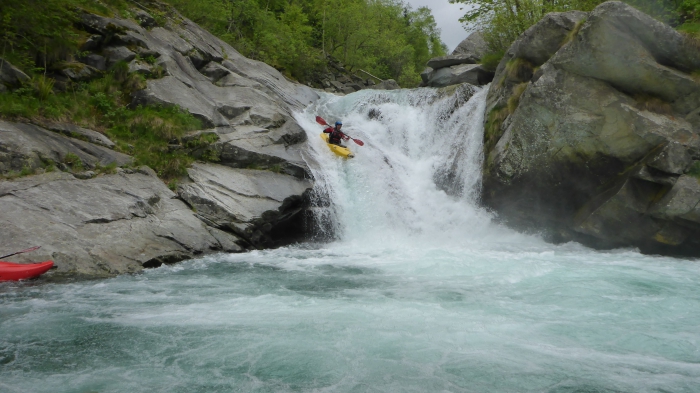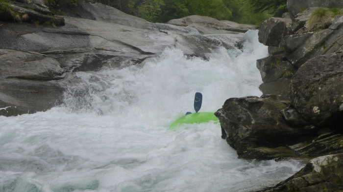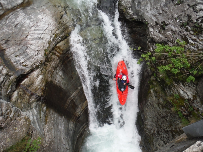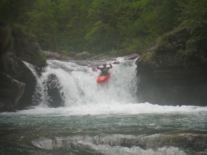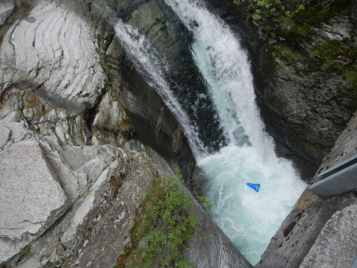 Aangekomen aan de laatste val, staat Team 1 al op het droge. Ook wij gaan naar boven, als plots enkele beginners afkomen. Ze moeten waaremple zelf allemaal rollen in een klein walsje voor de val, op bloed belust kijken we hoe deze amateurs de laatste val enkel met heel veel geluk overleven (tot twee maal toe). Maar ze zijn vergeten om de luchtzak mee te nemen, milieubewust als we zijn besluiten we om de rivier van het plastic onding te zuiveren en ik, Birdy en Peter gaan terug rivierwaarts.