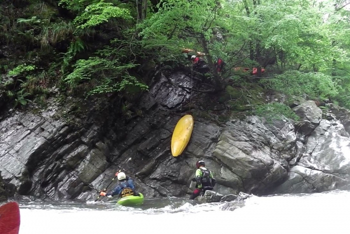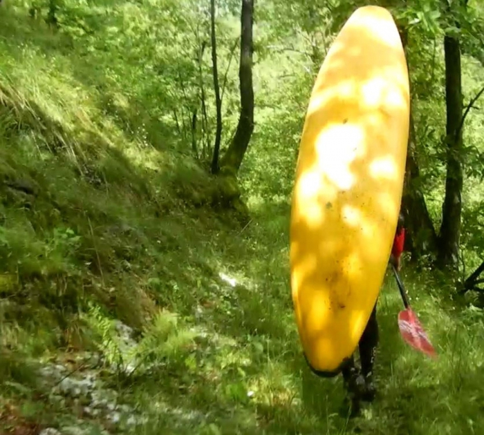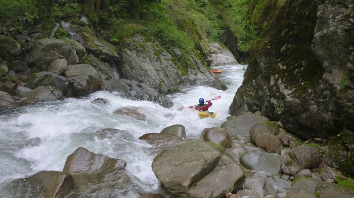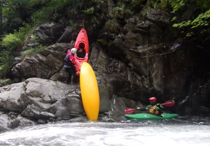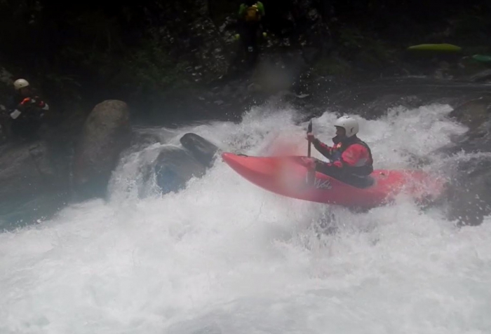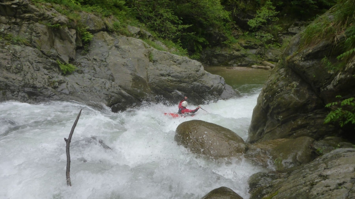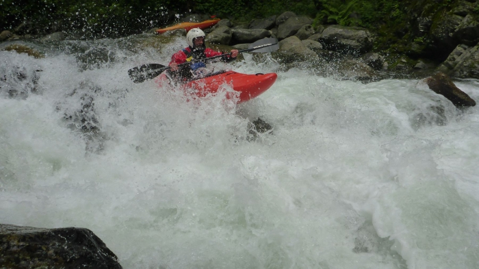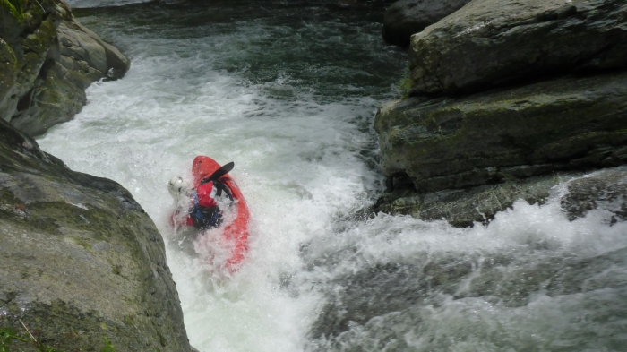Hetzelfde karakter van de rivier blijft nog wat aanhouden. Na een drop wordt ik rechts tegen een onderspoelde wand gedrukt. Bij het omgaan merk ik wel nog dat er geen onmiddellijk gevaar is en dat ik gewoon even moet wachten met rollen tot ik er voorbij ben. Ik wacht even, doe dan een poging maar ik zit eigenlijk al op de eerste trap van de volgende versnelling en zie in mijn ooghoeken dat er onderaan een boom dwars ligt. Ik kruip zo snal als ik kan uit mijn boot en grabbel me vast aan de rotsen. Ik doe nog een poging om het puntje van mijn boot te grabbelen maar die is niet meer te houden.