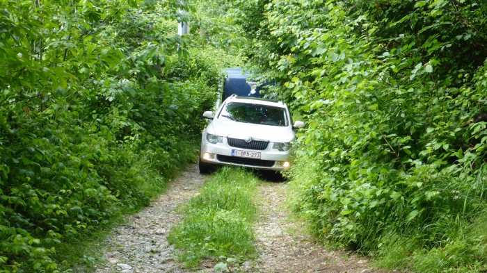 De weg naar de instap is een lang smal pad door het bos en de laatste kilometer moeten we te voet verder. Langsheen het wandelpad, in de schaduw, kruisen we her en der nog hoopjes hagel.