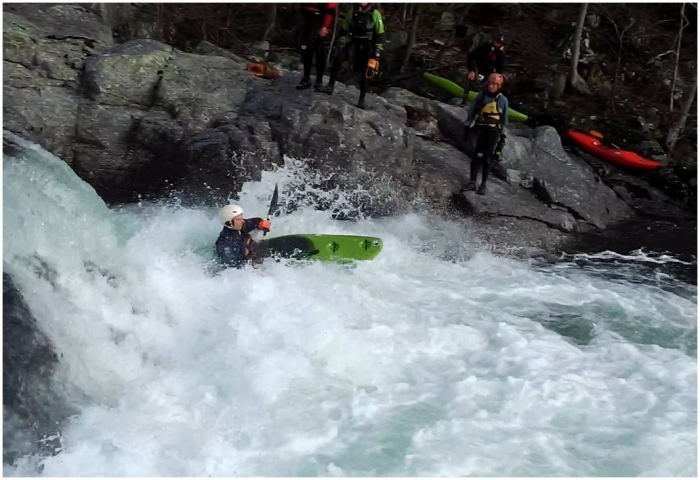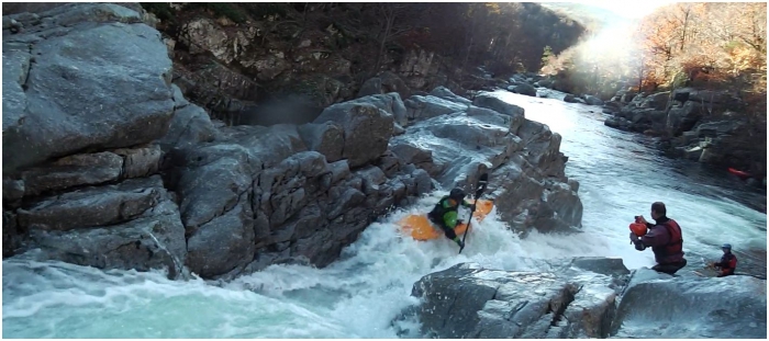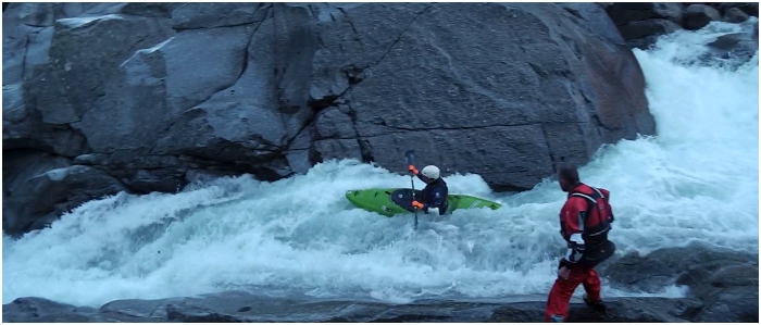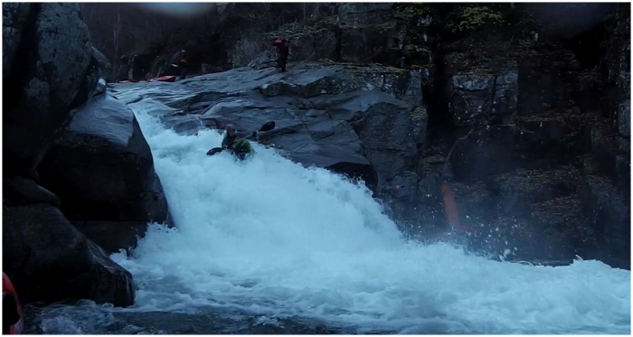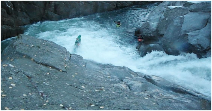 Vlak aan de camping ligt de eerste versnelling al te brullen, met een fokkietje in de hand ga ik alvast een blik werpen. De passage is niet van de poes, een val van een vijftal meter, een autoboof halverwege en verschillende rotsen aan de landing maken dit een potentiële ruggenbreker. Ik denk echter een lijn te zien langs volledig rechts, via een kanaal waar twee stoppers in zitten kan de autoboof vermeden worden. Samen met het ontwaken van de zon ontwaakt ook de rest van ons team. Na een versterkend ontbijt, wordt de versnelling nog eens door iedereen bekeken. Het resultaat is dat iedereen zijn rug lief heeft en beneden de camping instapt. Ik kan het echter niet laten en besluit er toch voor te gaan, Kapoentje en Birdy beloven ervoor te zorgen dat als het misloopt ik toch in zo weinig mogelijk stukken aan de kant geraak.