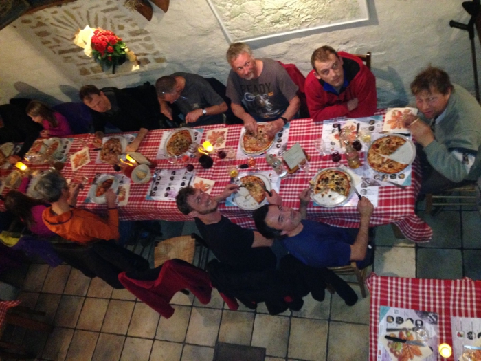 Na de epische afdalingen op de Dourbie, trekken we naar de Tarn voor een afdaling op de hoge Tarn. Na een uur kronkelbaantjes te hebben overleefd in de auto van Joosty X, alias Mr Go-Pro, alias Darth. Komen we met een rammelende maag aan in Florac, het stadje is zo goed als verlaten, gelukkig ziet vonkel een bordje met Pizzeria. HEIL VONKEL!!! We zijn de enige gasten in de pizzeria, dus de pizzaboer doet goede zaken vandaag.