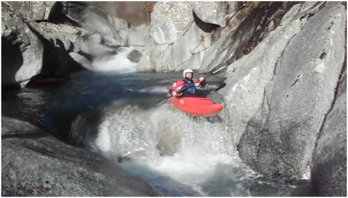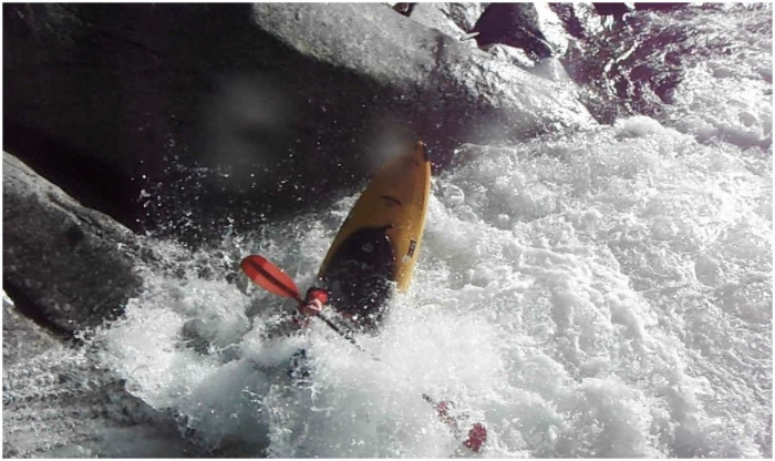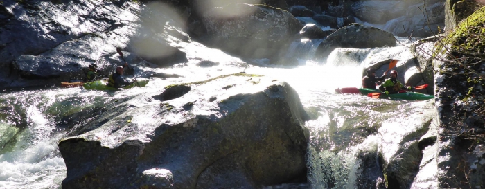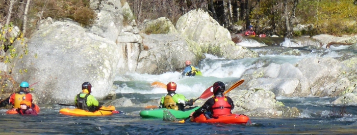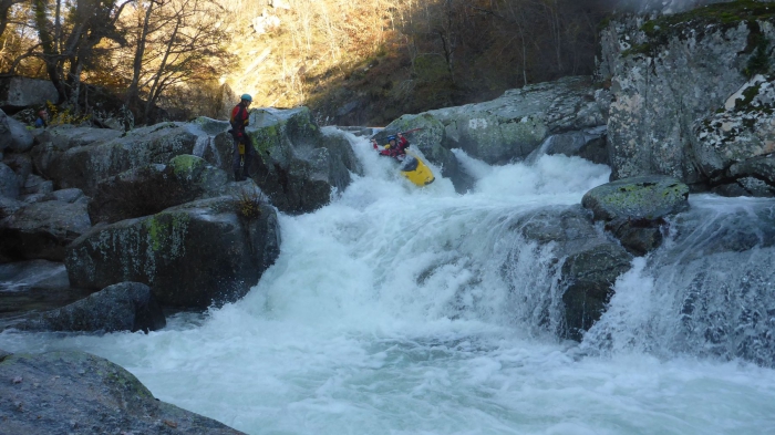 Na een versterkende lunch in een zalig Ceveniaans nazomerzonnetje vertrekken we voor traject 3. Volgens de beschrijving is dit stuk een pluske meer dan het vorige stuk. Het begin is vrij eenvoudig, maar het debiet laat geen twijfel bestaan, bij versmallingen, of drops is de Dourbie geen katje om zonder handschoenen aan te pakken. De eerste zware passages bevindt zich nadat een beekje bij de dourbie stroomt aan de linkeroever, Mr. Guide gaat uit op verkenning en doet teken om naar rechts te boofen. Enkel Wim en Bruno hebben de passage bekeken, maar blijkbaar is dit geen verzekering van een vlotte afvaart, want precies zij twee komen in de problemen.