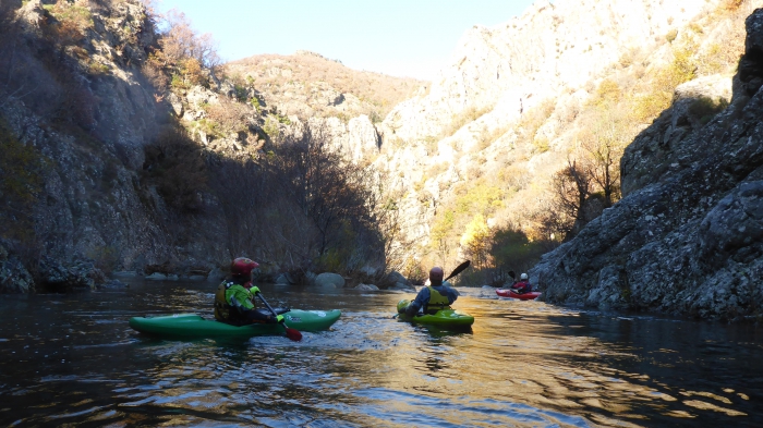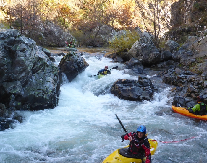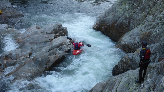 De waterstand is ondertussen verder gedaald tot een 65cm wat nog net genoeg is voor het stuk dat volgt. De eerste km omvat nog een vrij vlotte aaneenschakeling van klasse 4 versnellingen, het meeste wordt op zicht gevaren en Wim en ik zorgen voor nog wat vertier in een van de meer uitgesproken dropjes. Heel snel beginnen de pools tussen de rapids groter te worden wat meer tijd geeft om te genieten van de fantastische omgeving. Af en toe concentreren blijft echter noodzakelijk en de Dourbie blijft mooie versnellingen aanbieden met de occasionele omdrager. Plezant om wat meer relaxed te kunnen varen na de eerdere full on dagen.