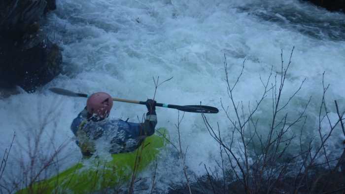 Halfweg het parcours stappen ook Joost, Stef en Jo in met de bedoeling nog wat ontspannen vaarkilometers te maken op het laatste stuk. Ik dacht dat dit vrij snel een nogal platte bedoening ging worden maar we bleven mooie versnellingen tegenkomen die af en toe toch een snelle inspectie en zelfs dry line noodzaakten, de afstand tussen de rapids werd wel groter en groter. Comedy moment van de dag was zeker de must-run rapid waar Birdy wat te lang in de lens keek en zich zijwaarts liet vangen in de afsluitende stopper. Dit gaf mij de perfecte schans om de stopper te vermijden en gelijktijdig Bert uit het gat te buldozeren, iedereen content!