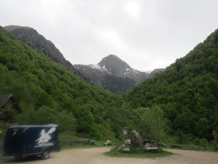 de parking aan de instap; boven in de bergen veel grijze wolken.