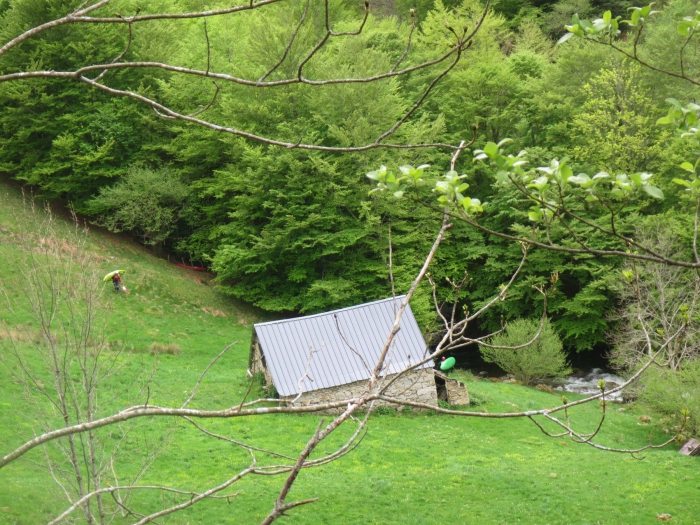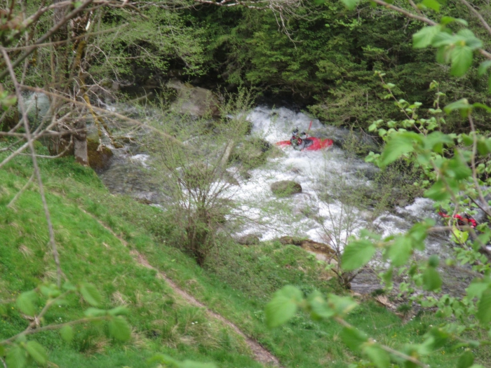 Maar dan volgt iets verder nog een drop die langs de ene zijde versperd is door hout en langs de andere zijde niet bevaarbaar lijkt. Deze moeten we omdragen. We moeten vrij hoog omhoog klefferen om hier rond te geraken en zien niet meteen een paadje om terug naar beneden te gaan. We stappen bovenop de kloof dan maar wat verder maar we komen uit op een zijrivier, die eveneens in een diepe kloof ligt. Er zit dus niets anders op dan een eindje terug keren en met touw af te dalen.