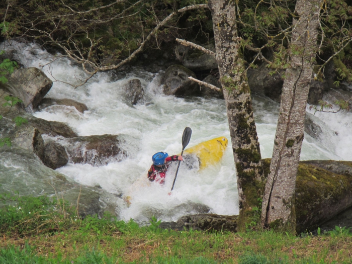 We doen het met de groep voorzichtig aan. Er wordt tijdig gestopt, gescout, gevaren, ? Maar dit kruipt wel in de kleren natuurlijk. Ondertussen blijft het regenen en gestaag merken we dat de rivier wat vlotter bevaarbaar wordt.