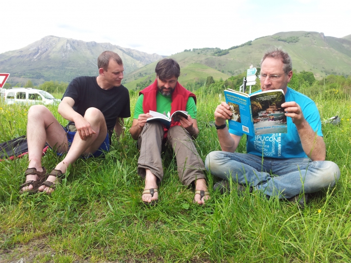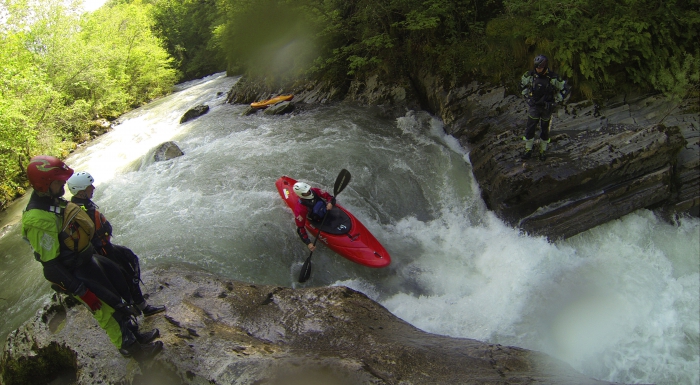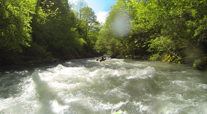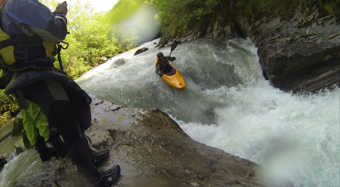 Het middenstuk van de Gave D'Aspe staat op het programma. Het is wat zoeken aan de instap: we staan aan een leuke passage maar dan moet je er wel wat klauterwerk voor over hebben of je stapt 150 meter verder langs een smal paadje door naar een evidente startplaats (later ontdekken we dat we makkelijk een brug verder hadden kunnen inzetten).