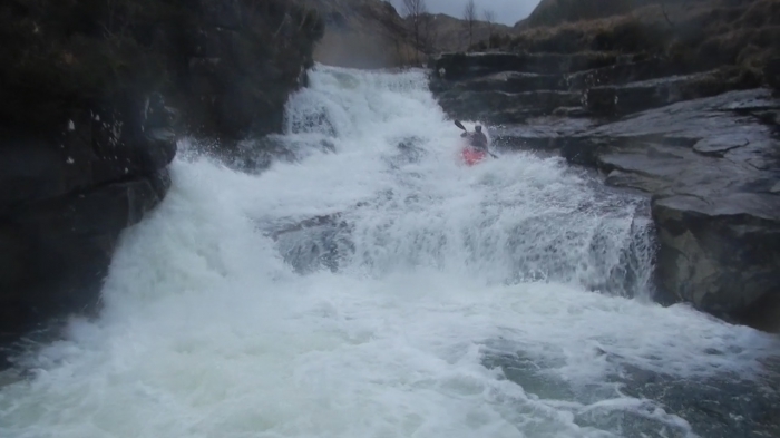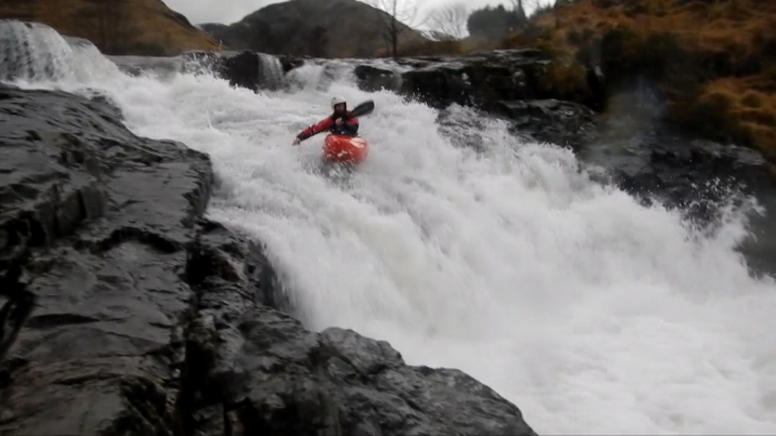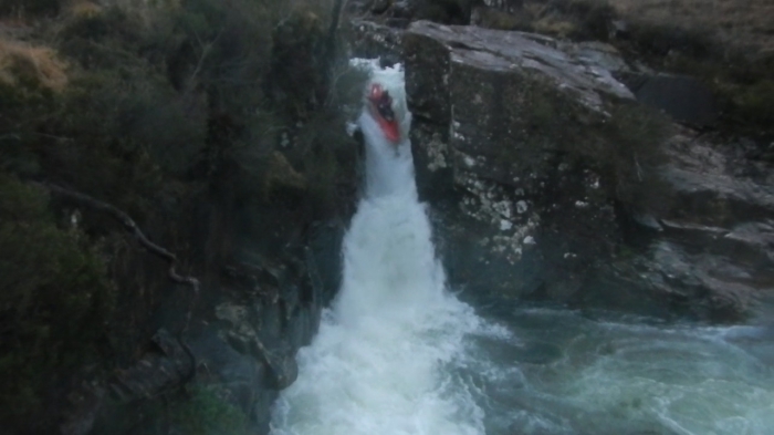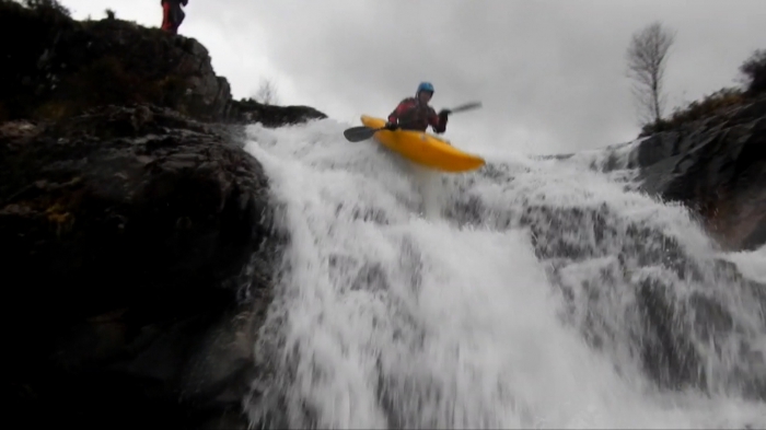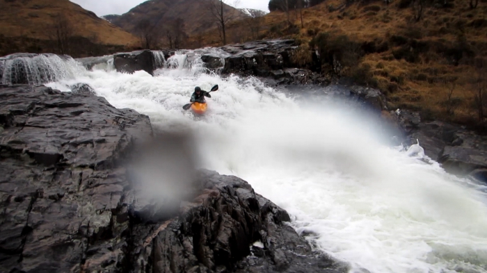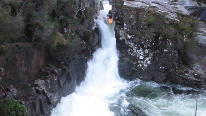 The last drop, 'Chasm', easy narrow impressive gap between sheer rock walls. Jet stream full ahead Ward slides down, goes under at the bottom... one...two... yeeh he pops up. Nice. He warns me of the two little waves at the entry, they really look innocent. But the first one stalls me and the second one hits my back deck, U-boat move, not a nice feeling at the top of a 4 meter drop. But ok, just slide down, roll at the bottom and we're off paddling towards the confluence of the Etive.