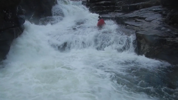 First slide, 'Speed', the narrow slot has become a powerful jet into a rock wall. Luckily the high water has opened a line next to the main fall, yeehaa over hardly an inch of water. Peter is that happy, he jumps in the water for a swim.