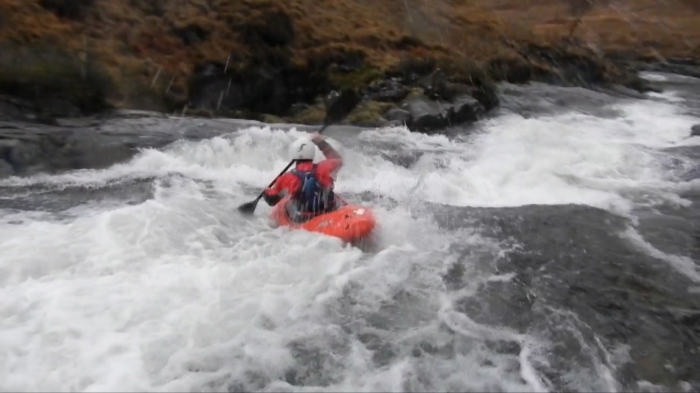 Next up, me, hey, we had a great run on the Etive, still living it up on those good vibes, I'm taking on the impossible hole, and YES, NO WAY TO PASS ai ai ai. After the wobbly entry slide, I hit the big hole slightly sideways, the impact tilts me immediately over. Upside down I stretch my paddle, hoping to get some pressure on it to roll. But no way, the hole turns and spins me upside, over and under.