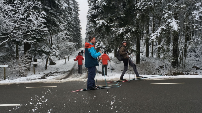 Op de allerhoogste toppen van de venen heeft het voldoende gesneeuwd en zijn enkele langlaufpistes geopend. Geen twijfel dus; dat hebben we met de club nog nooit eerder gedaan. Na een stevig toerke komen we nog net op tijd binnen. Gelukkig staat de J?germeister goed koud...