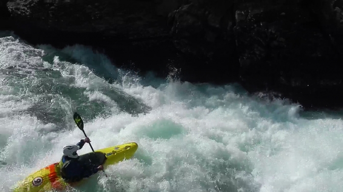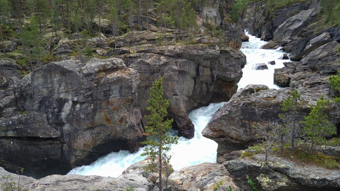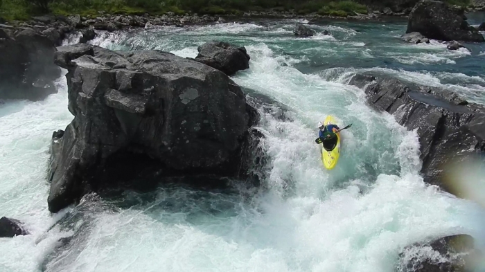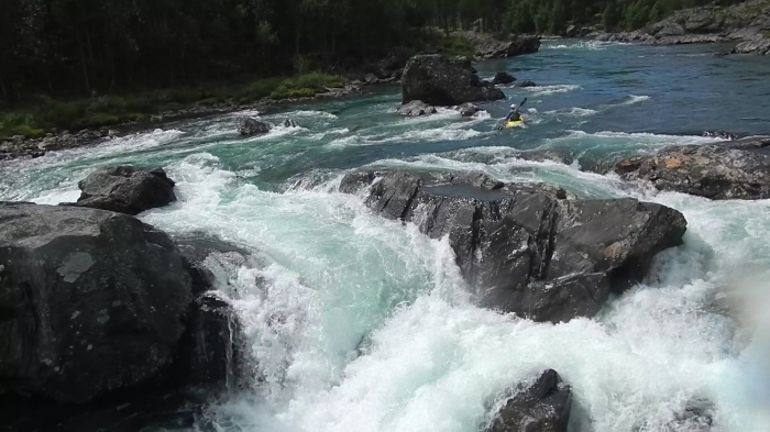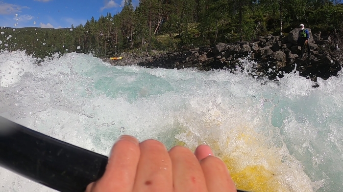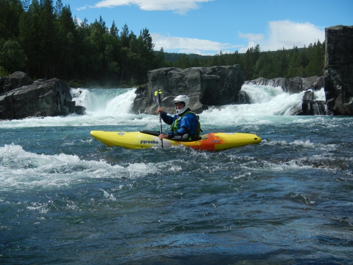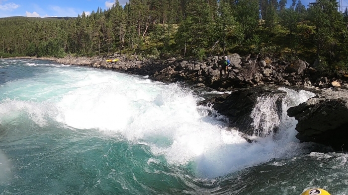 Ik vaar de Ridderspranget-val via de Z-bochten rivier links. De vieze dikke waterval meteen erna maakt grote indruk. Wordt dat ooit gevaren? Sporty gorge en Burusti zijn wel spek voor mijnen bek. Het is mn eerste keer in een Pyrhana 9r en ondanks de outfitting die nog niet super is afgesteld voor mij, vaart hij best vlot. Een pak sportiever/directer dan mijn DRX. Ik geniet. De volgende grote rapid (Toasty) skippen we omdat we barbies zijn.Vanaf daar is het knallen en genieten van read-and-run rapids tot het einde van Asengjuvet.