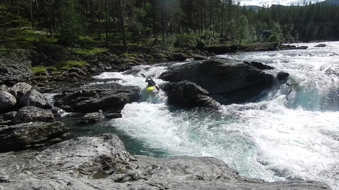 Er is blijkbaar een kajakfestivalletje gaande in Heidal, georganiseerd door Gene17 (Simon Westgarth). Bij het oprijden richting de instap van Ridderspranget stoppen we even aan de camping en kajakshop Strie Strommer in Heidal. Ik beslis een Pyrhana 9r L te testen van de shop. Na wat opbouwen binden we hem op t dak en knallen we naar de instap.