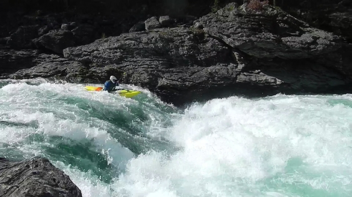 Na lange autostop-tocht, klaar voor het super helder blauwe water. De slide/himalaya-start laten we deze keer zo. Eerste waterval vaart Sander clean langs linker oever.