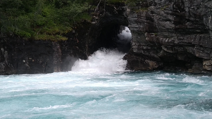 Rare kerels, die Noren. Komen ze een rivier tegen tijdens het bouwen van een trein-bedding. Oplossing? We blazen een gat door de rots naast de rivier, zodat de rivier daar door vloeit, en we onze trein-bedding over de lege rivierbedding kunnen leggen. Et voila, de tunnel-sectie is geboren. Om te gaan spotten kan je best naar boven rijden via de rechter-over tot op een onverharde piste. Je zal wat verder op die piste een wandelpad naar rechts zien vertrekken, richting de treinsporen en de tunnel-sectie.