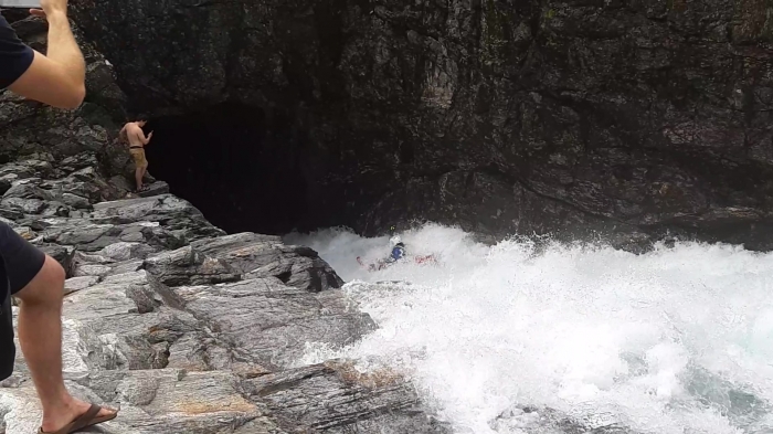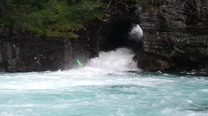 Na veel 'oh ah wauw' beslis ik om het een kans te geven. En dan duikt Yoran opnieuw op. Ideale timing. Hij en nog een pro-kayaker moedigen mij aan, tonen mij de juiste lijn om aan te varen en geven me de eer om er als eerste door te knallen. Ik ben best wel tevreden over mijn aanvaart. Zonder problemen verdwijn ik in de tunnel. Jammergenoeg word ik halfverwege de tunnel omgekiept en floep ik ondersteboven de tunnel uit. Het duurt even voor ik het juiste moment om te eskimoteren voel en tegen dan ben ik al buiten adem, dus toch maar zwemmen?. Daar gaat mijn hoop op eindelijk een kajak-verlof zonder zwemmen. Maar swat, no worries. De tunnelbodem heeft wat vlees van mijn vingers afgeschraapt, maar mijn goesting om te varen is nog intact. Ik twijfel even om opnieuw omhoog te klauteren voor poging 2, maar mn rechter wijsvinger begint stevig te zwellen, dus ik laat het voor bekeken. Next time?
