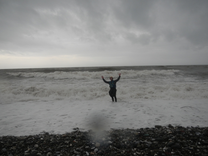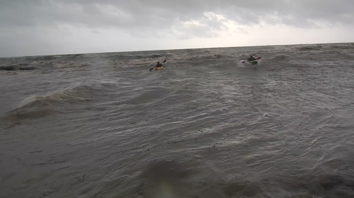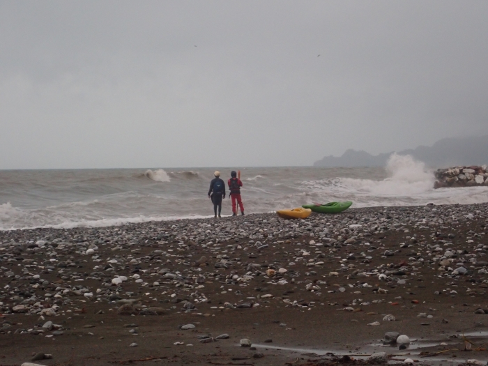 't Is impressionant hoe de branding op het keienstrand breekt, shore break, de golven breken op het keienstrand. Dus met de kajak surfen zit er niet in, we laten de bootjes even op het strand en duiken zo de branding in, dikke fun.