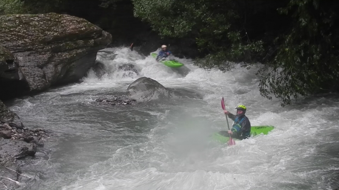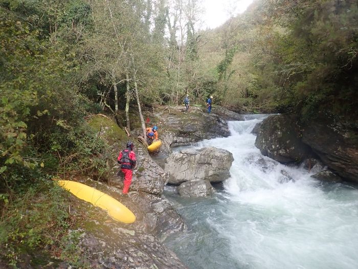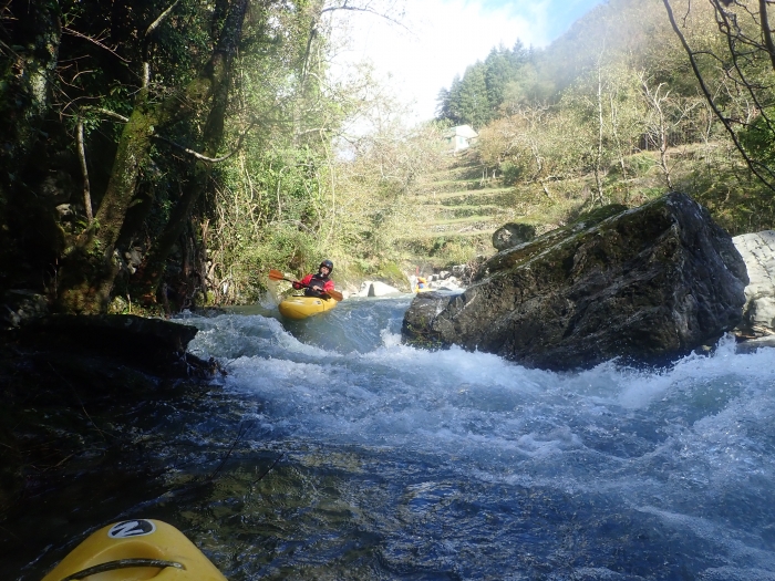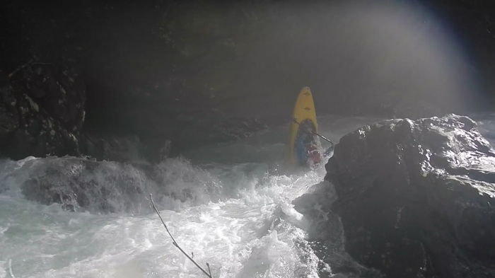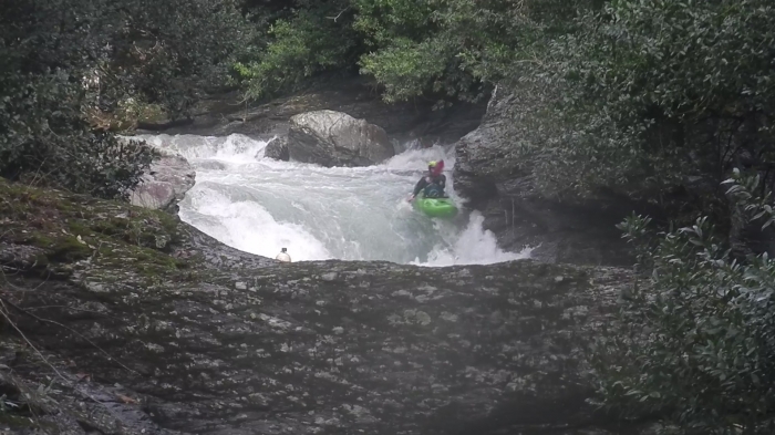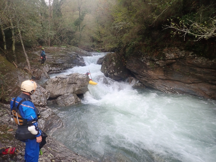 Wel een trappen passage met hoog fun gehalte. Midden aanvaren, mikken naar rechts om tegen de kant te boofen, turbulente pool en aanleggen voor 2de verval met rappel.