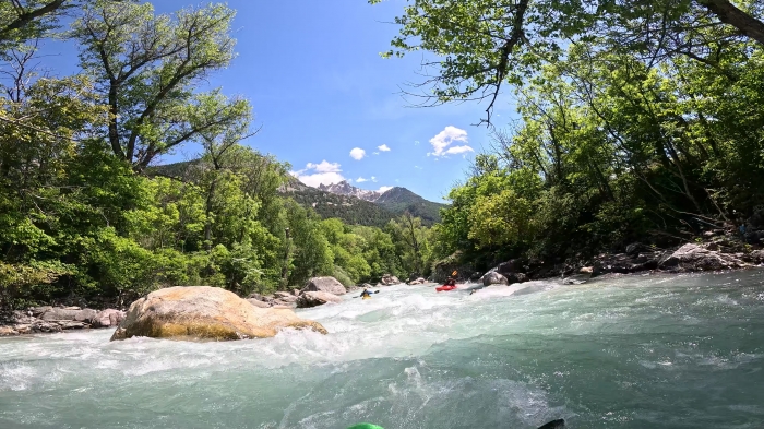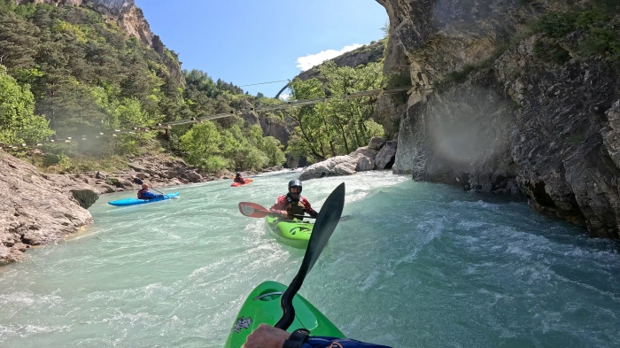 Na een paar meter rustig water vertrekt de Durance in een lange denderende versnelling. Bruno klassificeerde het vooraf nog als "een beetje drop-pool". Drop klopt, de pools waren weg ?.