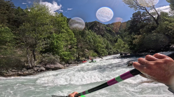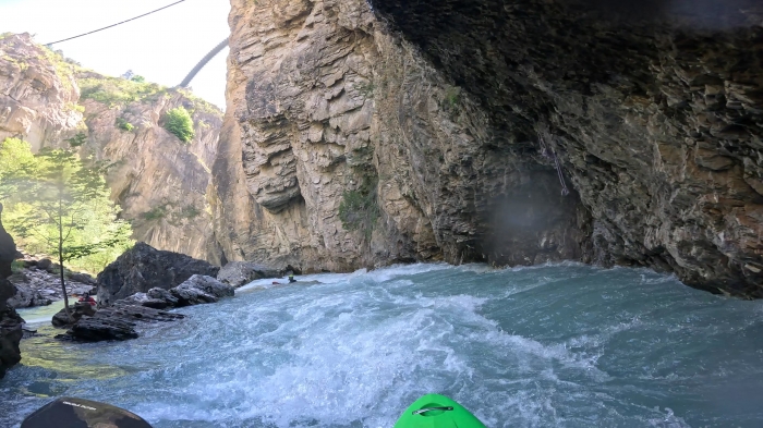 De kloof wordt hoger en steiler met soms loodrechte wanden, schitterend. De passages worden minder heftig totdat de hele rivier links in een 2 meter brede gang verdwijnt. "Slot en drop" wordt verkend waarbij de meesten hun boot alvast mee nemen. Dan blijkt het toch wel te doen, de "slot" is bij deze waterstand makkelijk en de drop op tempo goed te boofen.