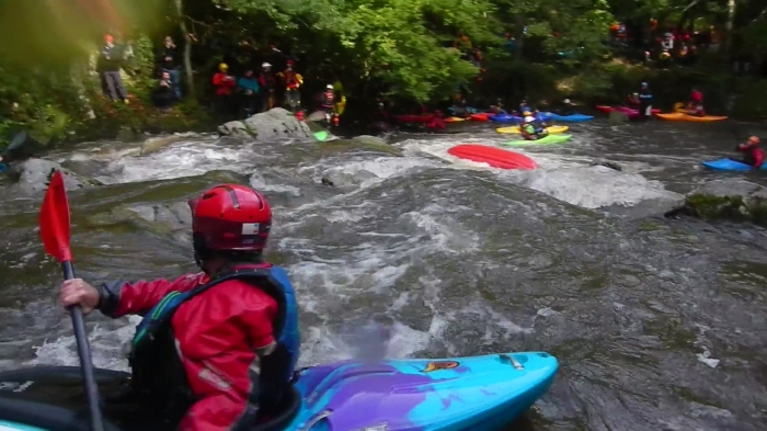 Mooi weertje, gezellige drukte... of toch heel soms een beetje een 'te' gezellige drukte. Tijdens onze afdalingen viel het best mee, we konden overal opdragen en verschillende keren de versnellingen varen. Maar soms kwam er een golf van kajakkers aan, keerwaters vol en dus zonder kijken of stoppen naar beneden donderen... te gek om te zien.. van aan de kant :-)))