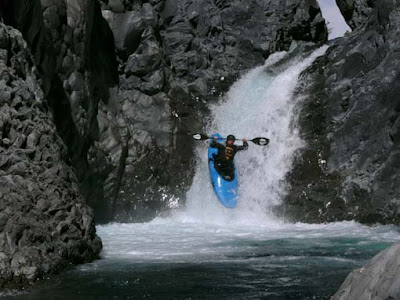 Beneden aan de val staan de camera's klaar. Ik vaar rustig aan, glijd over het randje en duik het sop in. De impact is hard. M'n bootje komt weer boven op z'n kop en als ik wil rollen voel ik dat m'n peddel gebroken is (niet verwonderlijk; er zat al een tijdje een barst in). Damn! Tja dan maar aan het lusje trekken. Ik pak een achterpuntje vast en word snel naar de kant gebracht, want op het einde van deze pool zit een val die niet gevaren wordt. Intussen duikt Gert de laatste drop af en bij het boven komen zie ik dat z'n blad gebroken is.
