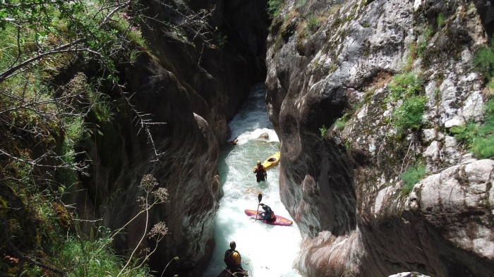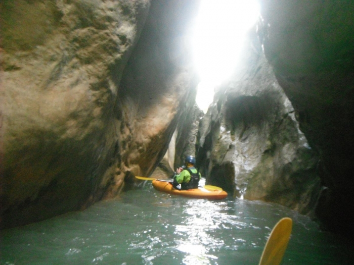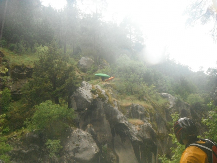 Rond 17 uur komen we aan het houten bruggetje of de eerste vluchtroute uit de kloof. De Schuur stelt voor om hier te stoppen: portage van hier uit zal misschien wel een uurtje duren maar we zijn dan toch zeker dat we uit de kloof kunnen.