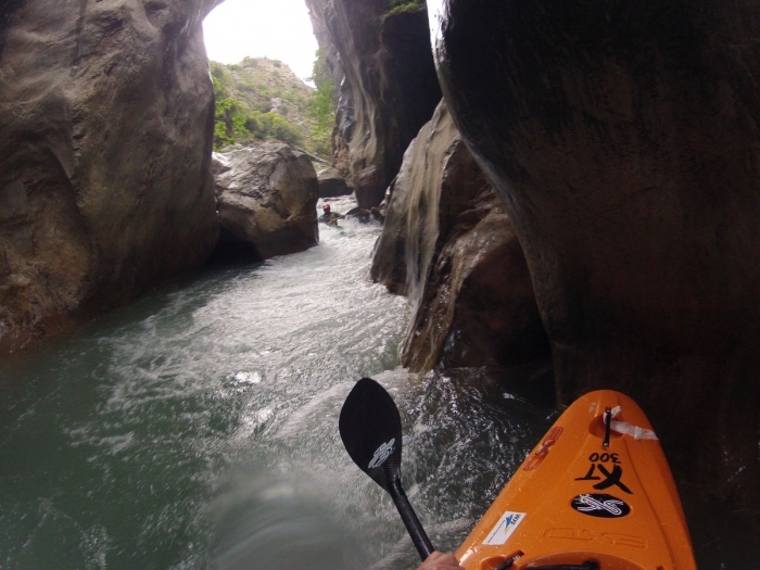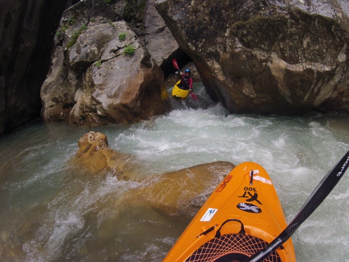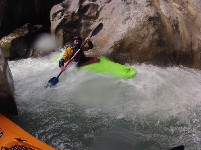 Bij een mooi dropje ben ik de voorlaatste die aanvaart. Iedereen is er netjes doorgekomen dus zal de lichtste van de kajakkers wel geen probleem geven zeker. Mis dus... de punt van mijn Zet blijft rotsvast steken en ik krijg het water van de drop mooi in mijn nek. In mijn pogingen om los te komen zwaai ik blijkbaar genoeg met mijn peddel zodat Gert efkes wacht en niet op me invaart.