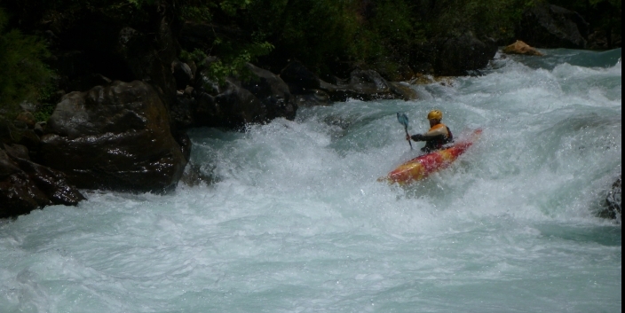 Na een tijdje zien we links sporen van een aardverschuiving, waardoor er een versnelling ontstaan is met serieus wat druk erop. Sommigen dragen, sommigen varen de linker rustige lijn, Bruno vaart de hoofdstroom op rechts, maar gaat iets teveel naar 't midden, de Scheuer roept nog, "rechts rechts", hij knalt nog net door een dik gat, salto komt verticaal, maar schiet er mooi door. Ik, Birdy, volg ook de rechter hoofdstroom, effe slikken, dit gaat hard, maar gelukkig ook goed, yeehaa.