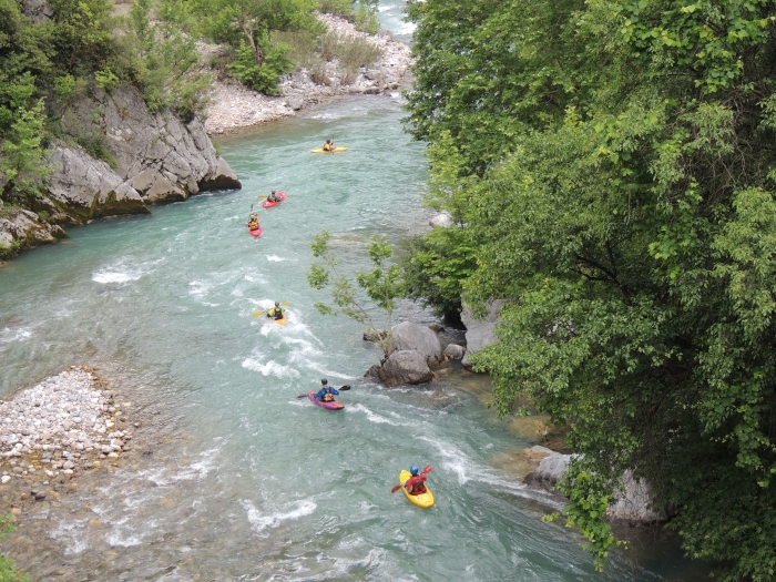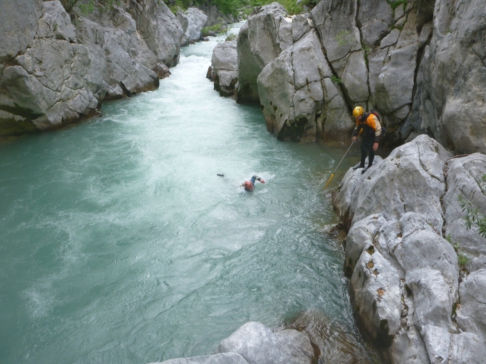Dan is 't terug een heel eind plat, tot de gps van de gids aangeeft dat we een een onbevaarbaar stuk naderen. We beginnen te dragen, klimmen naar de weg, maar de Vonkel en ik zien een manier om aan het water te dragen. Na 2 maal een 10-tal meter gedragen te hebben, dobberen we verder, maar zien de anderen hoger en hoger omdragen, een 50-tal m hoog op de bergflank. Zou er nog iets volgen??? Oops, prijs, om de hoek nog een zwaar passage. Gelukkig komen de Scheuer en Bruno aangevaren, we dragen deels over en varen de rest, waarna de rest er terug bijkomt.