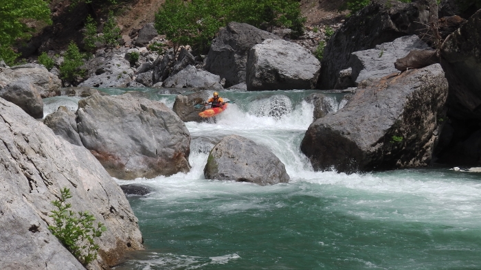 De eerste passages zijn niet echt moeilijk maar het is wel onmiddellijk duidelijk dat er veel meer debiet zit op deze rivier dan op de vorige. De eerste zware passage bestaat uit een rots in het midden met langs links een zijstroom (chickenlijn) en rechts de hoofdstroom (herolijn).