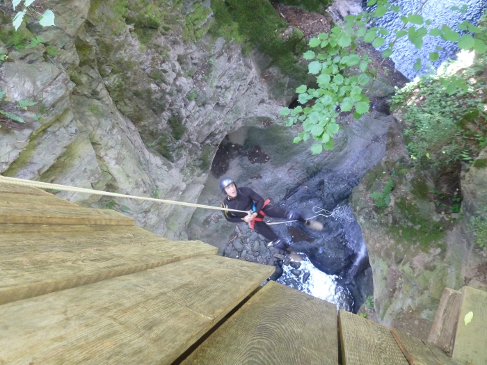 Er volgen nog een viertal tobogans wat klauterwerk en een tamelijk mooie 45 meter rappel. Als we bijna bij de uitstap zijn worden we ingehaald door een klein groepje (4 man) onder leiding van een lokale gids. Het volgende deel van de canyon is volgens hem zeker de moeite waard... pro forma geeft hij nog wat tips en waarschuwingen en gaat dan voort. We twijfelen even of we stoppen of niet maar na wat manipulatief gedrag van Ward beslissen we om ook de rest van de kloof te doen.