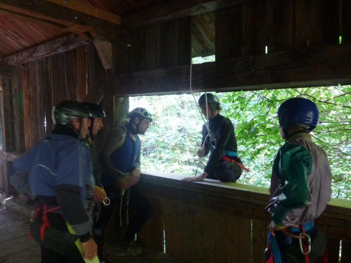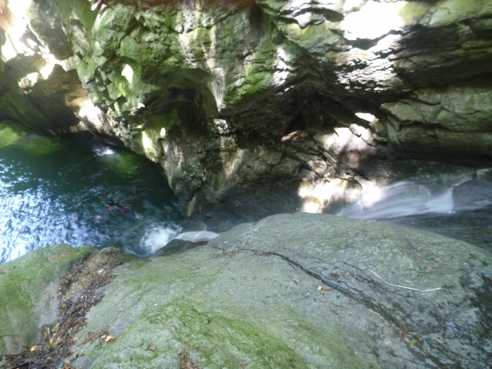 Dan wordt het puffen... een uurtje aanlopen, gelukkig voornamelijk in het bos, waarbij de nodige hoogtemeters moeten overwonnen worden. De instap is een 25m rappel vanuit een overdekte brug. Nog efkes het zweet inhouden dus voor die eerste verfrissende duik er aankomt. Maar die duik mag er dan ook zijn... een glijbaan van 13 meter is de start van een paar uurtjes waterpret.