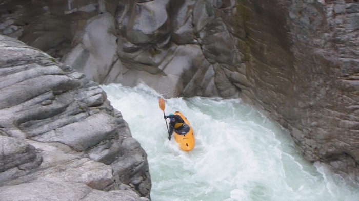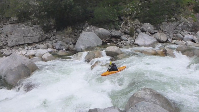 With no place left in the eddies, Jorg opens up a particularly steep staircase, starting with a 1.5m boof and then round a big midriver boulder with no obvious way out.