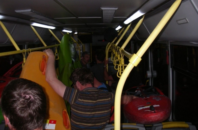 22:55 h : Joost heeft de chauffeur van een stadsbus kunnen overtuigen (lees omkopen) om ons tot bij de andere terminal te brengen. Alle boten worden afgeladen van die bagage karretjes en in die bus gewrongen.