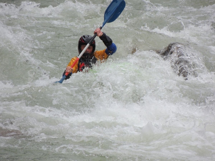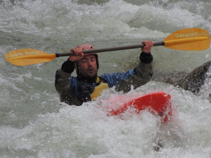 Tijdens het uitvaren van zo`n eddy, word ik geramd door den tjoep, die, komende van links, ondoordacht en zonder kijken van een valletje komt. Resultaat: allebei ondersteboven. Een getrainde Nirjharaan zet zo`n situatie natuurlijk 'recht' met een rol. Dus geen zwemmers. Zonder excuses van de rivierpiraat gaan we verder.